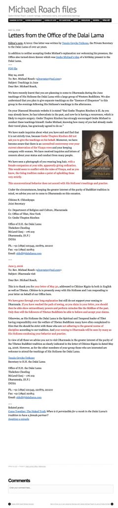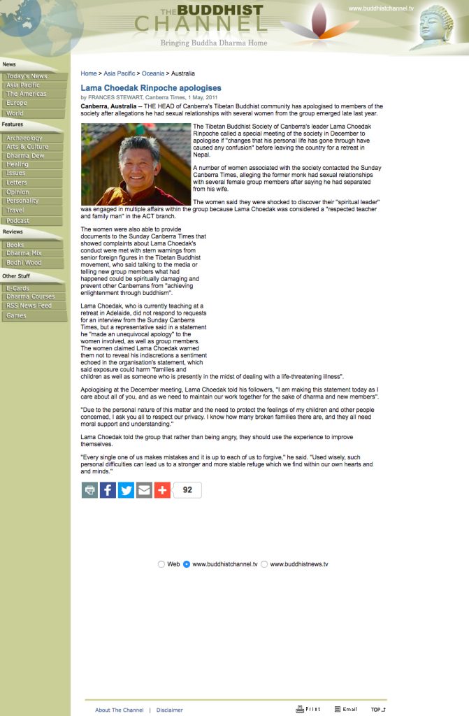 In 2006, the Dalai Lama’s private secretary, who takes his instructions from the Dalai Lama, wrote a letter to Michael Roach discouraging him from attending the Dalai Lama’s upcoming teachings in Dharamsala on account of his “keeping company with women” and “unconventional behavior”. This communication has since been made available to the public (click here for the PDF version). Yet, we do not see any signs of the Dalai Lama or the CTA doing the same for Sogyal Rinpoche, Sakyong Mipham Rinpoche or Lama Choedak Rinpoche, even though their crimes are arguably worse than Michael Roach’s. Therefore, the question that begs asking is, if the Dalai Lama’s secretary can write to Michael Roach, why do they not write to these other teachers who are doing even more harm? Some people may argue that Michael Roach is a monk of the Gelugpa tradition and therefore is subject to stricter rules of conduct compared to monks of the Nyingma and Kagyu traditions. But that is totally besides the point. Molesting, harassing, accosting or raping women is 100% wrong regardless of whether you are a monk or not, and regardless of what Buddhist tradition you come from. This is the issue that must be addressed.