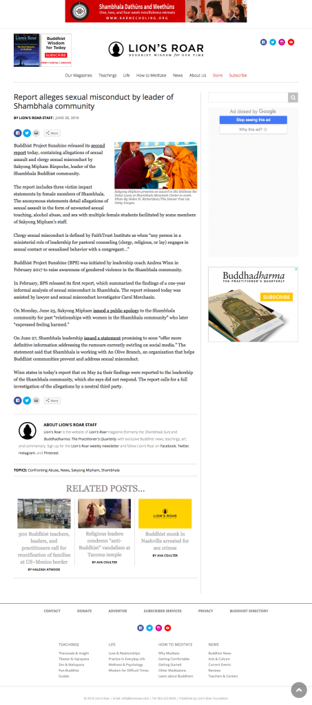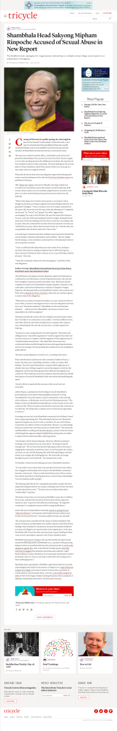 Even before these scandals had a chance to subside, we now see reports that yet another Tibetan Buddhist lama has been accused of sexual abuse, carnal misconduct and even allusions to rape. The lama in question this time is Sakyong Mipham Rinpoche, the leader of Shambhala International.